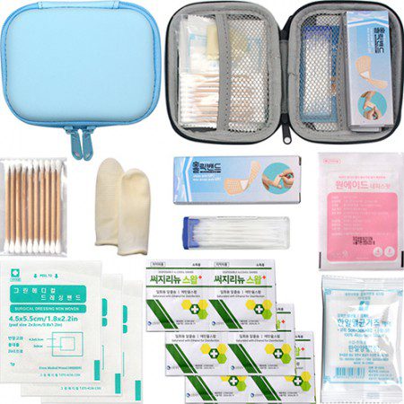 - 드레싱밴드, 알코올 솜, 면봉, 지시테이프 등 응급 상황을 대비한 필수 구성품.