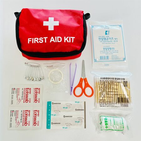 - 구성품: 가위, 핀셋, 일회용 밴드, 거즈, 알코올 솜, 면봉, 의료용 테이프 등.