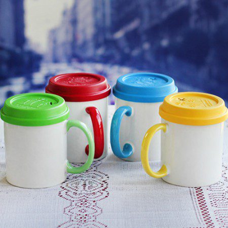 - 레드, 옐로우, 그린, 블루 등 다양한 컬러의 뚜껑과 손잡이로 제작된 머그컵입니다.