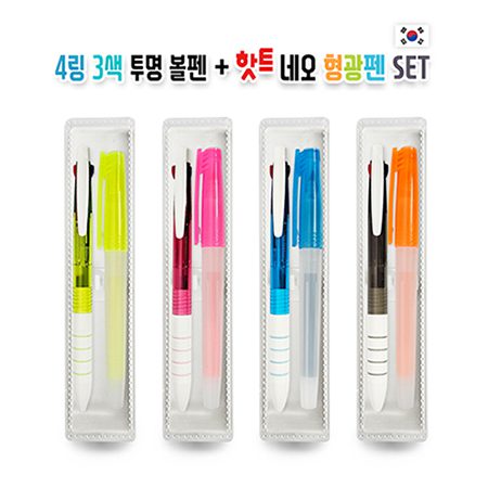 볼펜판촉물 4링3색 투명볼펜+핫트 네오 형광펜 세트 제작